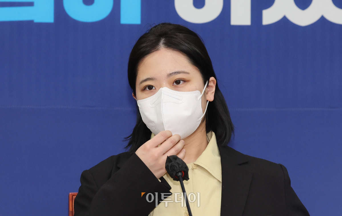 더불어민주당 박지현 공동비상대책위원장이 22일 오후 서울 여의도 국회에서 열린 2045 민주당 정치인 연대 '그린벨트'와 민주당 비대위와의 간담회에서 마스크를 만지고 있다.