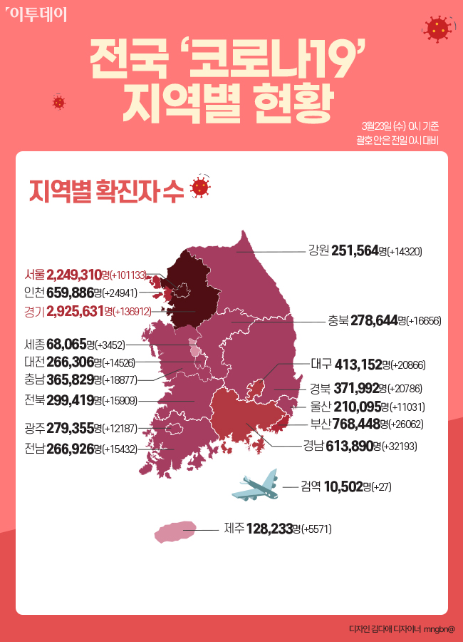 [코로나19 현황] 국내 확진자 ‘총 1042만7247명’ 49만881명 추가…누적 확진자 1000만 명 넘어- 3월 23일 0시