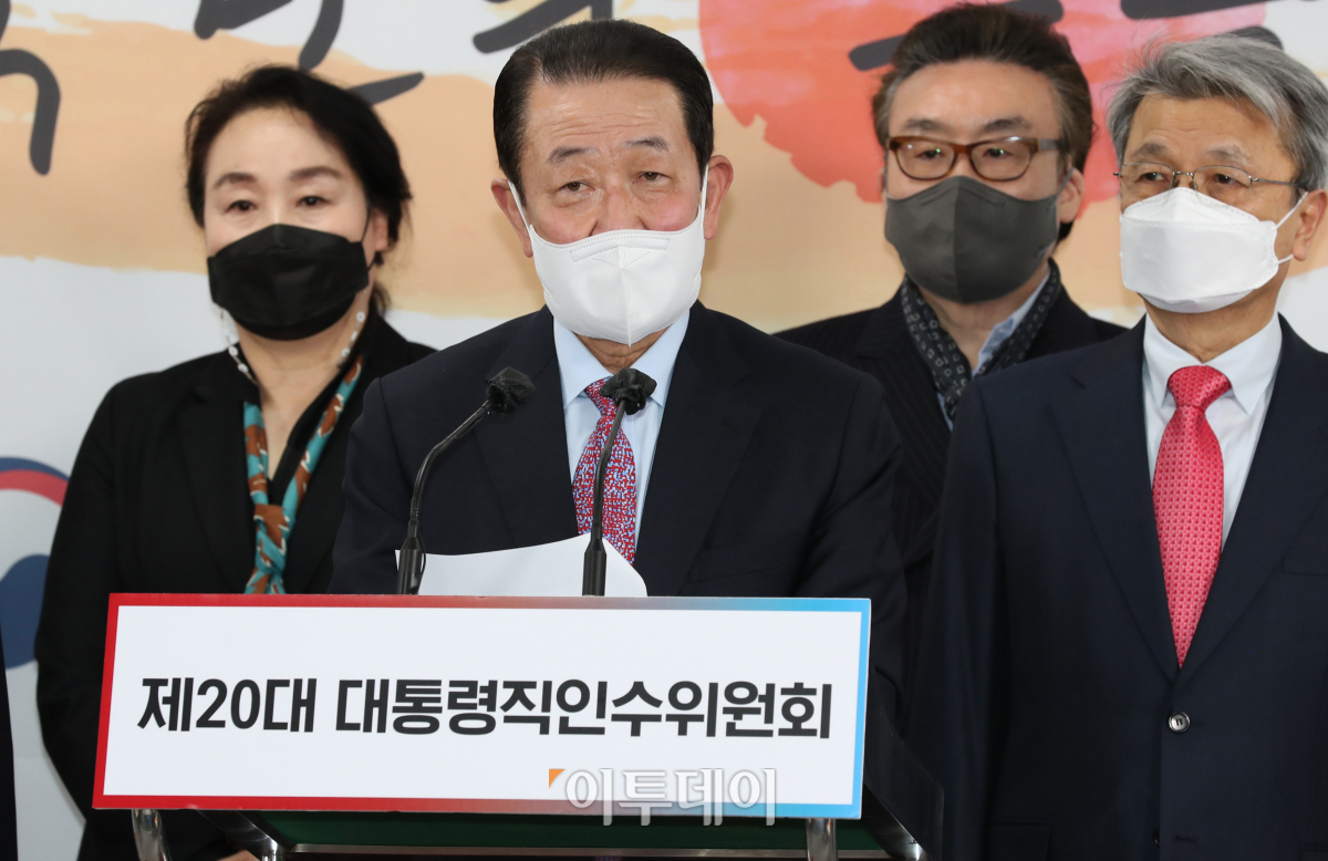 20대 대통령 취임준비위원회 박주선 위원장이 23일 서울 삼청동 한국금융연수원 별관에 마련된 인수위원회 기자실에서 취임과 관련, 위원회 인선과 업무추진 현황에 대한 기자회견을 하고 있다. 국회사진취재단