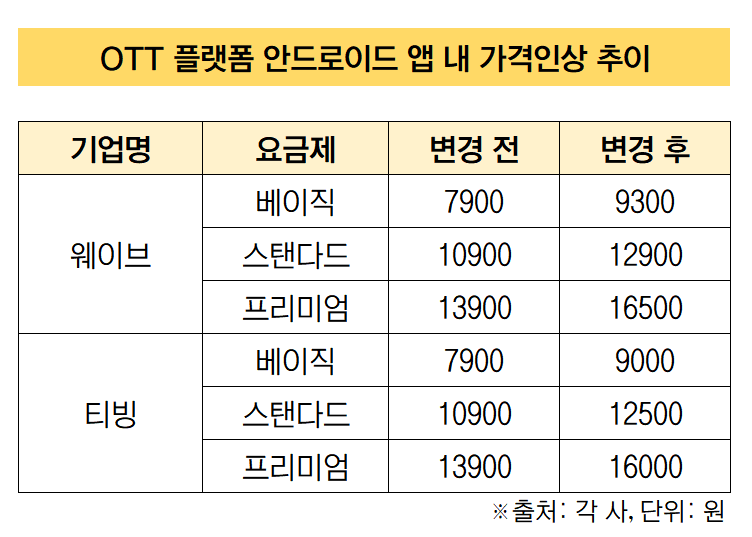 OTT ‘웨이브’는 다음달부터 구글 인앱결제를 사용할 경우 기존 7900원이던 베이직 요금제를 9300원으로, 1만900원이던 스탠다드 요금제를 1만2900원으로 올릴 예정입니다. 프리미엄은 1만3900원에서 1만6500원으로 2600원 오릅니다.