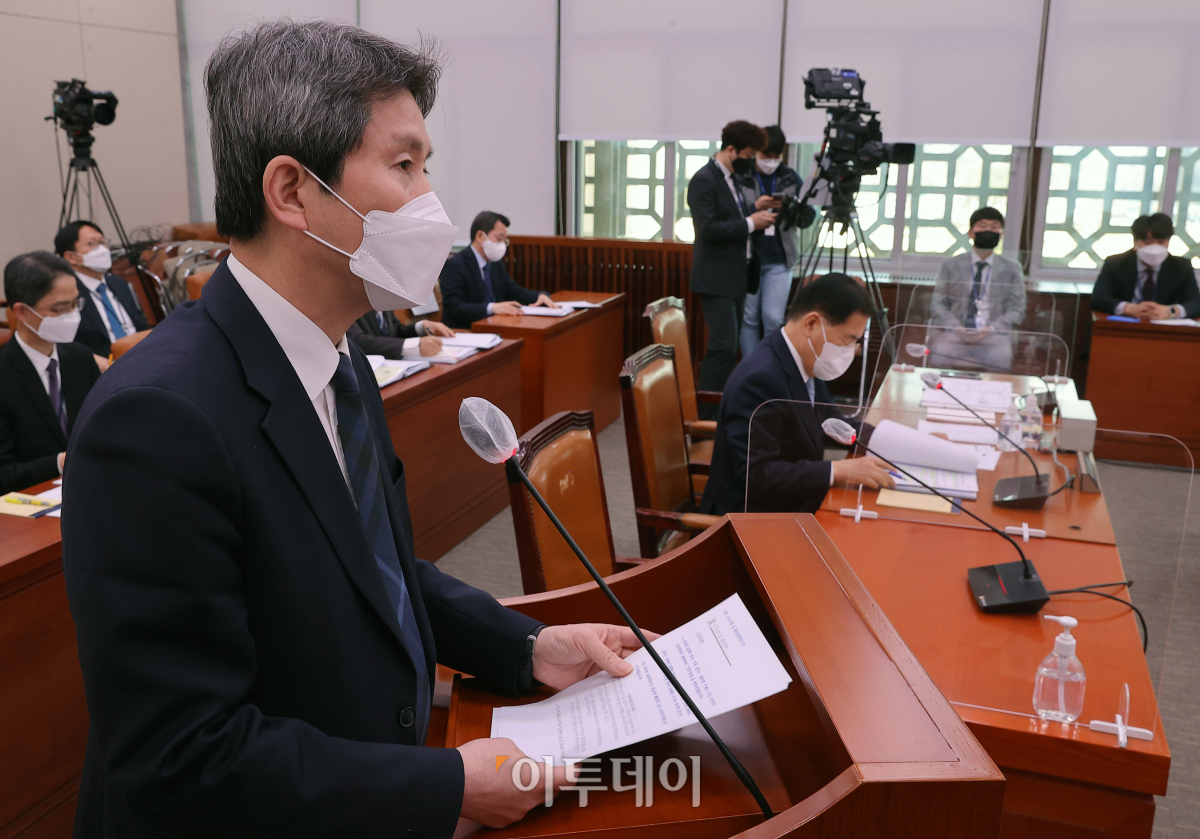 이인영 통일부 장관이 28일 서울 여의도 국회에서 열린 외교통일위원회 전체회의에서 북한의 장거리 미사일 발사에 관한 긴급현안보고를 하고 있다.