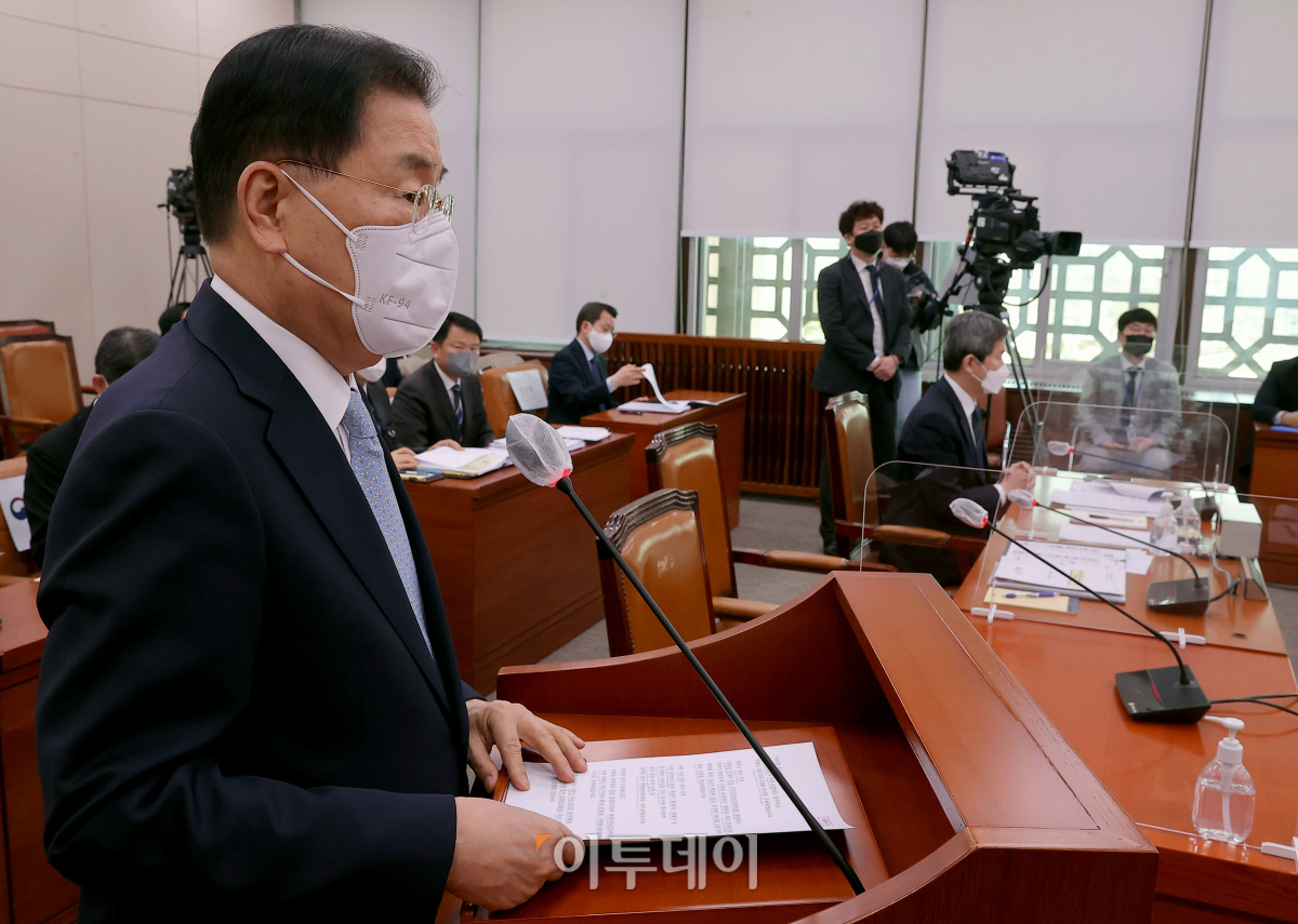 정의용 외교부 장관이 28일 서울 여의도 국회에서 열린 외교통일위원회 전체회의에서 북한의 장거리 미사일 발사에 관한 긴급현안보고를 하고 있다.