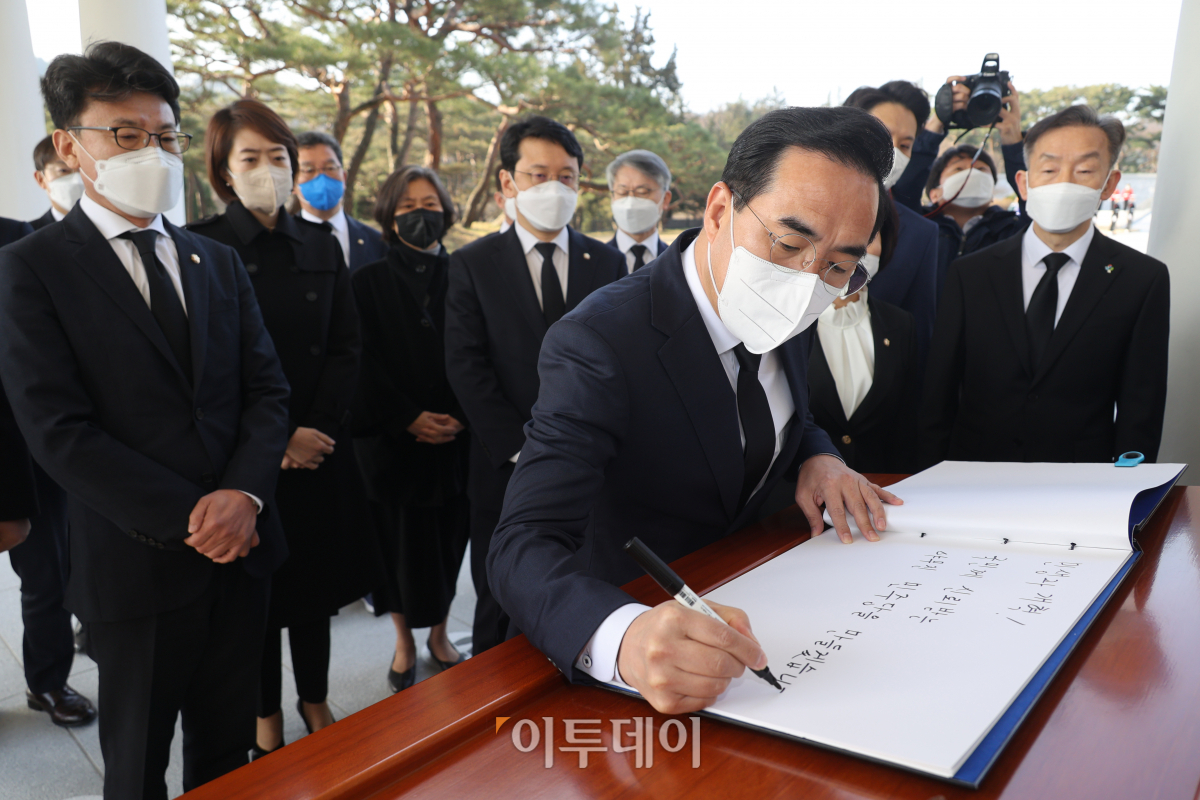 더불어민주당 박홍근 신임 원내대표가 29일 오전 서울 동작구 국립서울현충원에서 참배를 마친 뒤 방명록을 작성하고 있다. 국회사진취재단