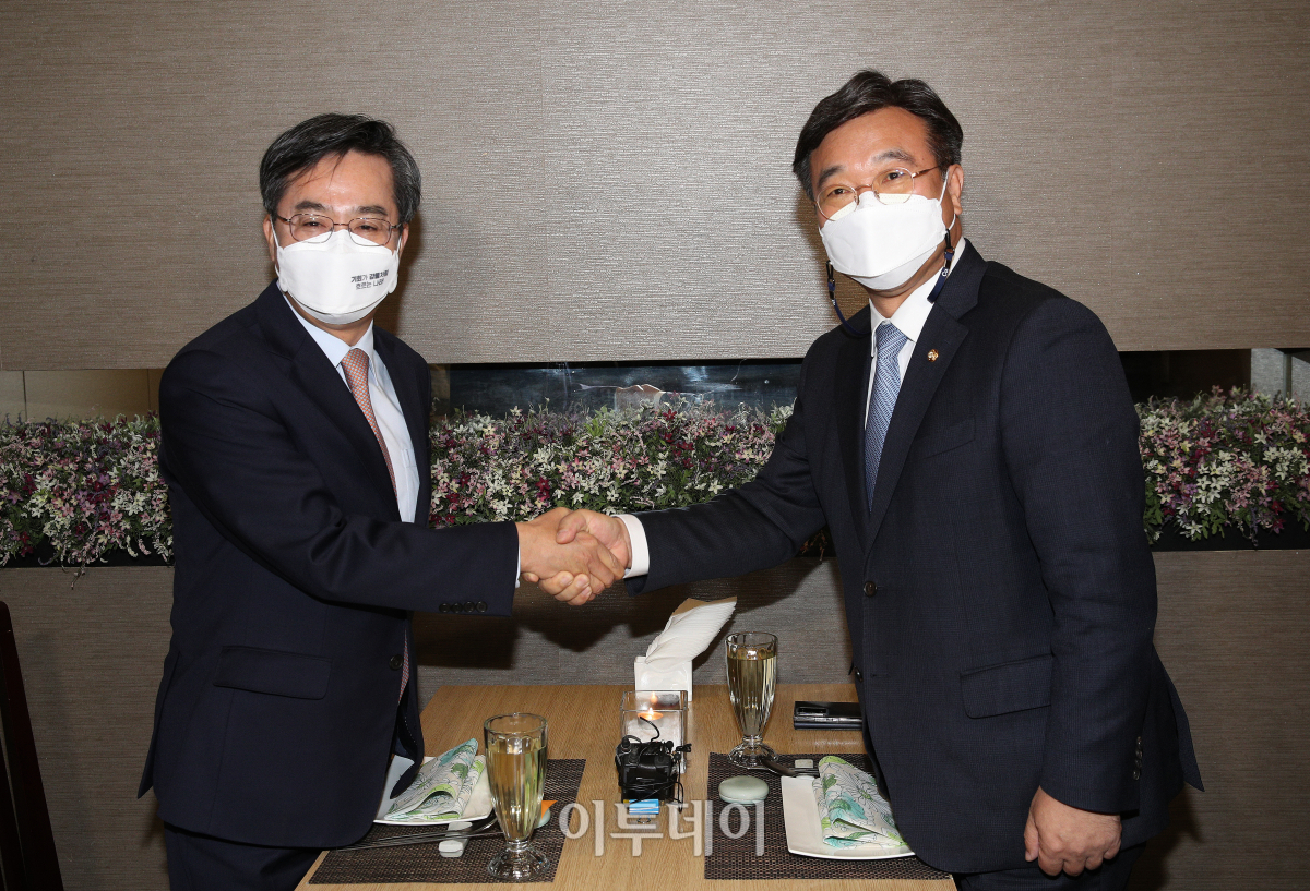 윤호중 더불어민주당 공동비대위원장(오른쪽)과 김동연 새로운물결 대표가 30일 서울 여의도 한정식당에서 오찬 회동을 갖고 있다. 윤 위원장과 김 대표는 이날 회동에서 양당 합당 및 6.1 지방선거 출마 등과 관련해 의견을 나눴다.