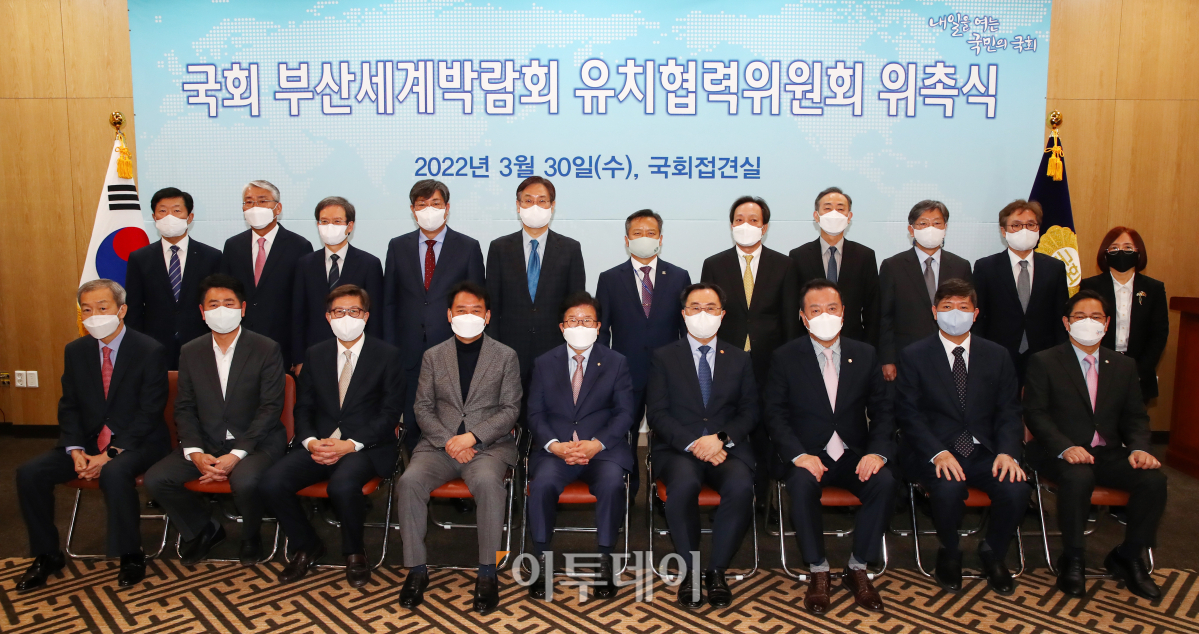박병석 국회의장과 이광재 위원장, 박형준 부산시장 등 참석자들이 30일 오후 국회에서 열린 부산세계박람회 유치협력위원회 위촉식 및 1차회의에서 기념촬영을 하고 있다.