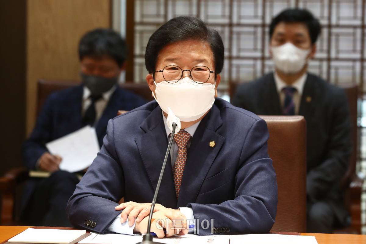 30일 오후 국회에서 열린 부산세계박람회 유치협력위원회 위촉식 및 1차회의에서 박병석 국회의장이 인사말을 하고 있다.