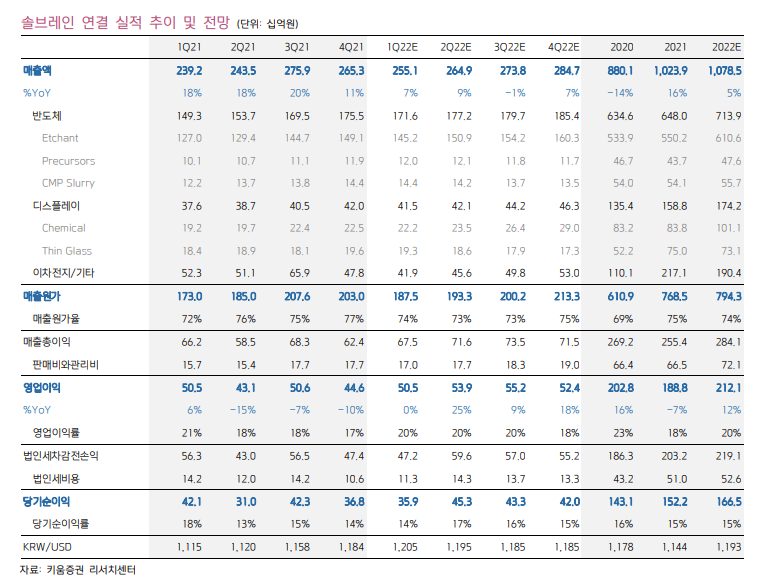 31일 박유악 키움증권 연구원은 "그 동안 전사 수익성 둔화와 주가 하락의 원인으로 작용해왔던 이차전지 전해액 부문의 실적 턴어라운드가 본격화될 것으로 전망한다"면서 "솔브레인의 이차전지 전해액 부문은 주요 고객사로의 공급량 확대를 통해 2020년 2분기부터 큰 폭의 매출 성장을 이뤄왔지만, 수익성은 원재료(전해질, LiPF6) 가격의 급등으로 부진한 흐름을 겪어왔다"고 설명했다.