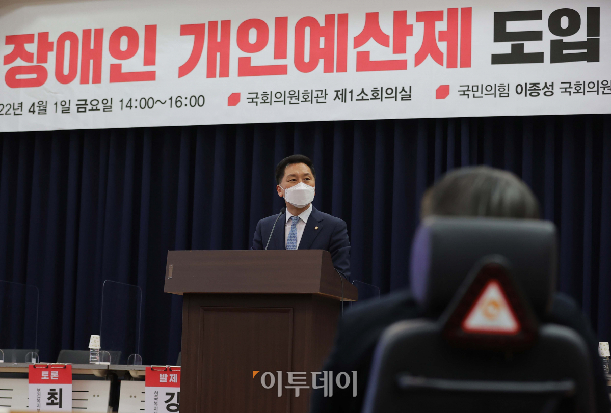 김기현 국민의힘 원내대표가 1일 서울 여의도 국회의원회관에서 열린 이종성 의원실 주최 ‘장애인 개인예산제 도입 방안과 과제’ 토론회에서 축사하고 있다.