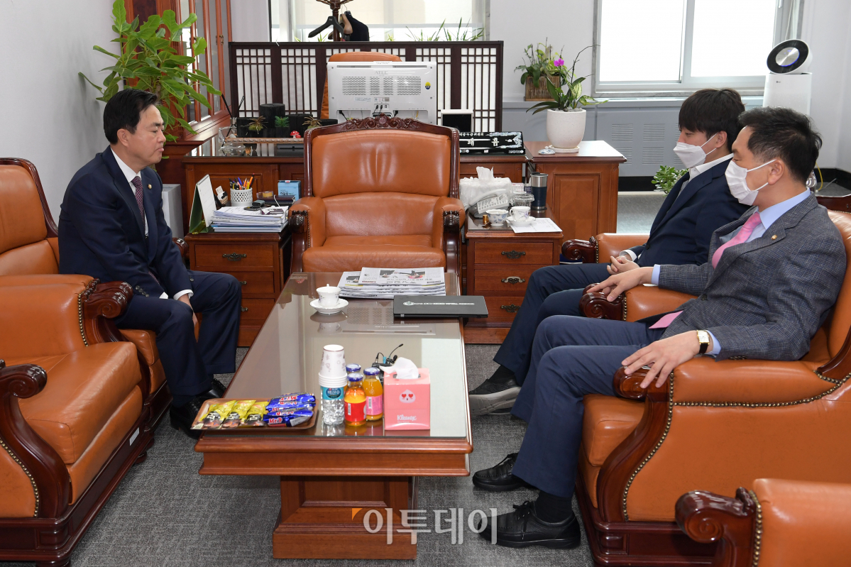 이준석 국민의힘 대표와 김기현 원내대표가 4일 오전 서울 여의도 국회 농해수위 위원장실에서 원내대표 출마 의사를 밝힌 김태흠 의원을 만나 면담하고 있다.