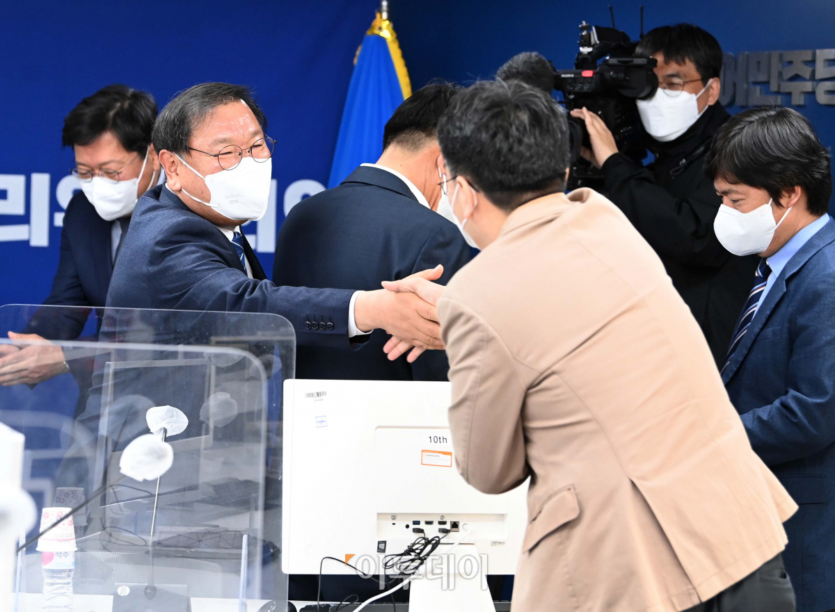 더불어민주당 6·1지방선거 중앙당 공직선거후보자추천관리위원회의 첫 회의가 4일 오후 서울 여의도 더불어민주당 당사에서 열린 가운데 김태년 공천관리위원장이 참석자들과 인사를 나누고 있다.