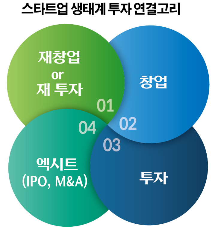 엑시트를 통해 이익을 본 투자자의 자금은 새로운 스타트업에 대한 재투자로 이어진다. 성공적인 엑시트를 한 창업가는 또 다시 창업에 도전하고, 성공한 선배 창업가들의 선례를 보고 능력 있는 청년들이 창업에 뛰어든다. 이른바 ‘창업→투자→엑시트→재창업 혹은 재투자’의 연결고리다.