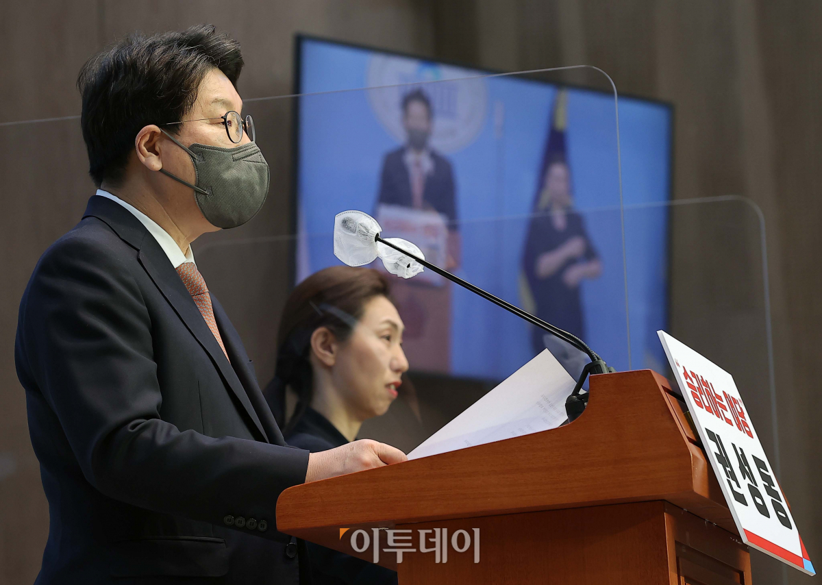 국민의힘 권성동 의원이 5일 서울 여의도 국회 소통관에서 원내대표 출마 기자회견을 갖고 있다.
