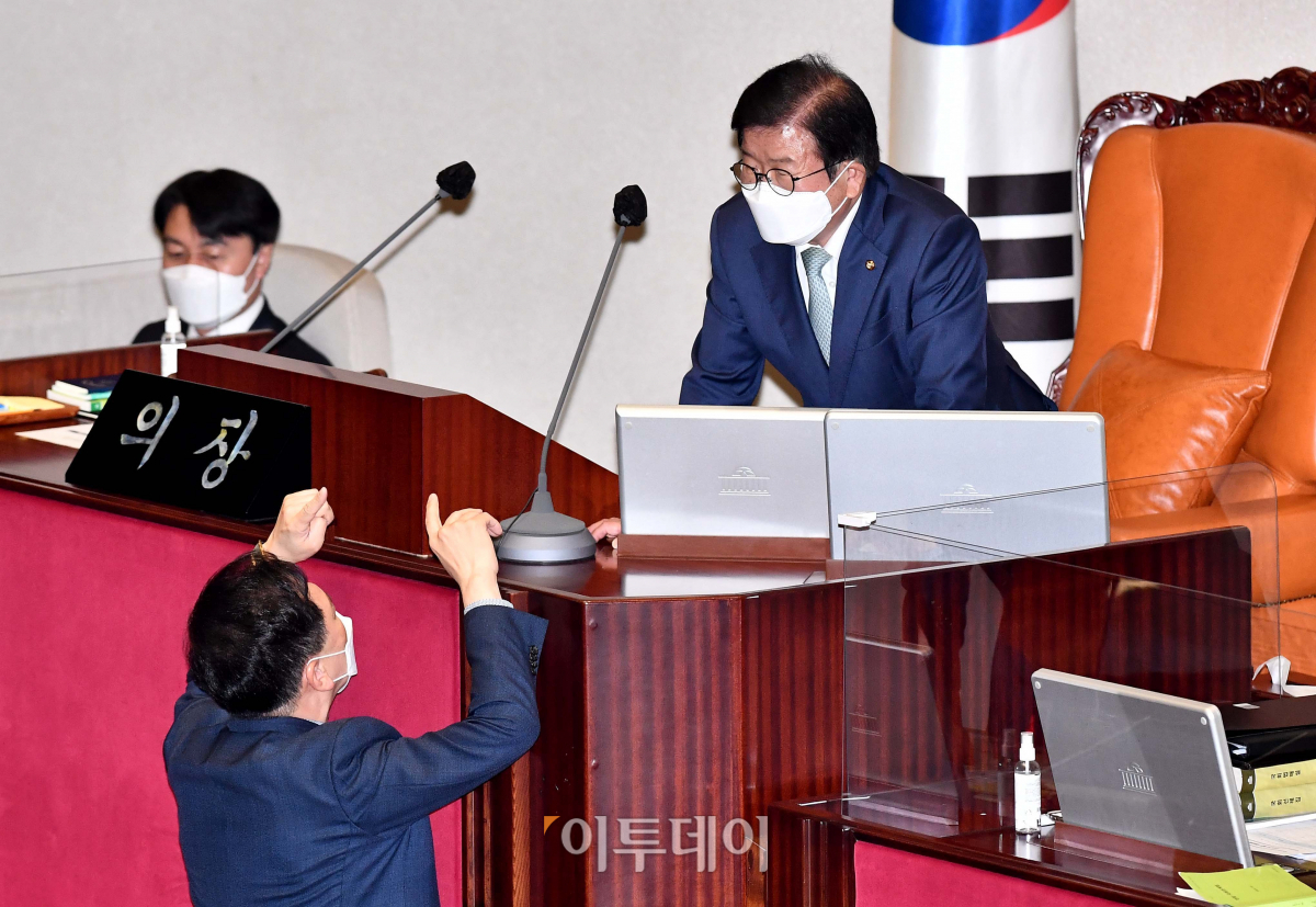 5일 서울 여의도 국회에서 열린 본회의에서 박병석(오른쪽) 국회의장과 김기현 국민의힘 원내대표가 대화하고 있다.