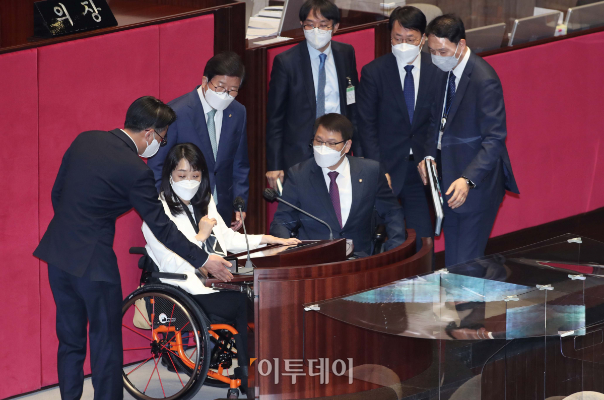 5일 서울 여의도 국회에서 열린 본회의에서 박병석 국회의장과 최혜영 민주당 의원, 이종성 국민의힘 의원 등이 휠체어에 탑승한채로 발언할수 있도록 개선된 발언대를 살펴보고 있다.