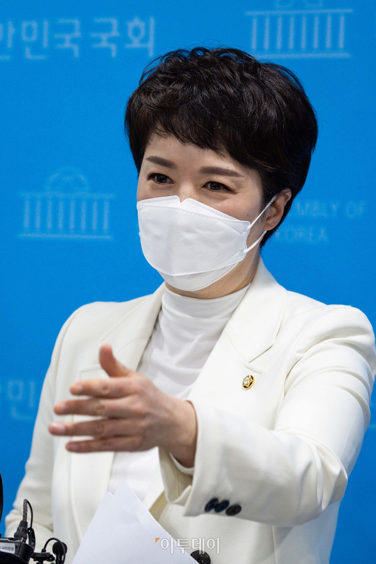 김은혜 국민의힘 의원이 6일 서울 여의도 국회 소통관에서 기자회견을 열고 경기도지사 출마를 선언한 후 취재진 질문에 답하고 있다.