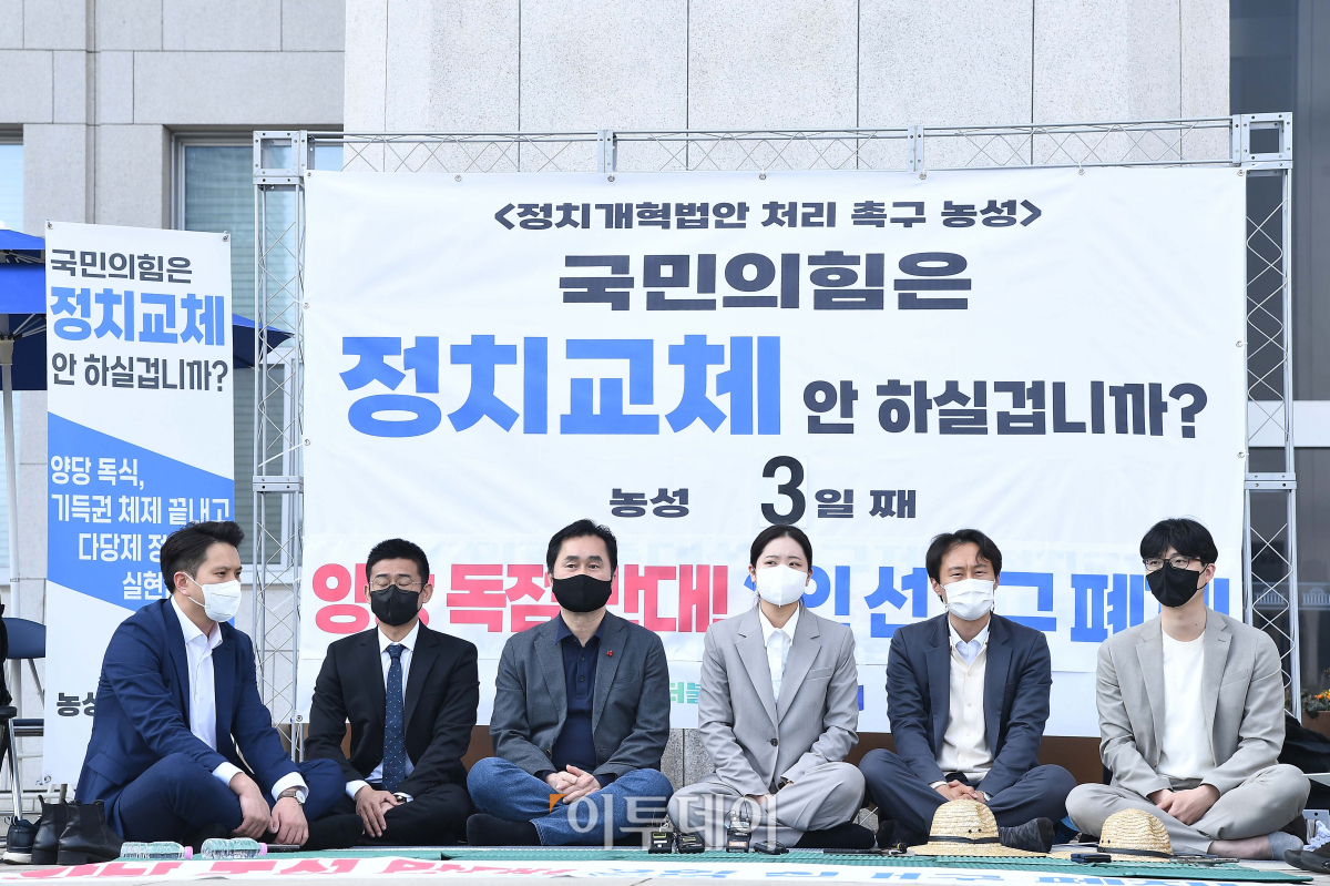 더불어민주당 박지현 공동비상대책위원장이 6일 서울 여의도 국회에서 열린 정치개혁법안 처리 촉구 농성장에서 발언하고 있다. 더불어민주당 의원 74명은 지난 4일부터 기초의원 3인 이상 중대선거구제 도입을 골자로 하는 ‘공직선거법 개정안’ 등 정치개혁 법안들의 처리를 촉구하며 국회 앞에서 무기한 농성을 하고 있다. 사진 왼쪽부터 전용기 의원, 김태진 비대 위원, 김종민 의원, 박 공동비상대책위원장, 이탄희 의원, 권지웅 비대 위원.