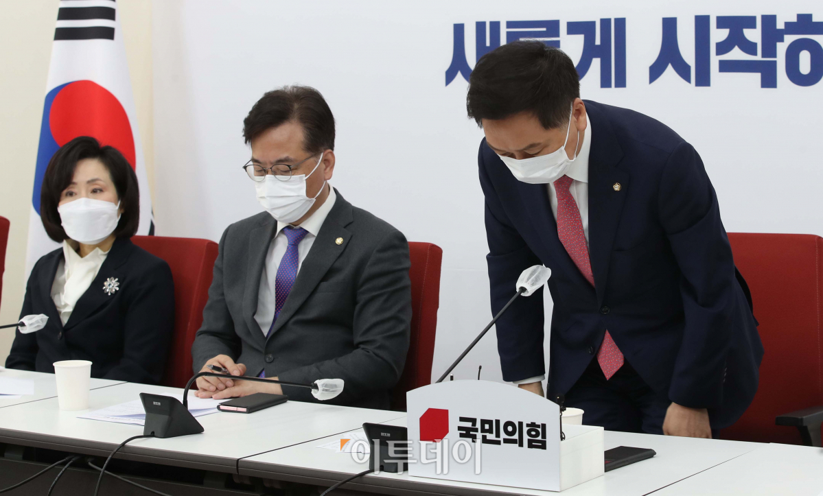 김기현 국민의힘 원내대표가 7일 서울 여의도 국회에서 열린 퇴임 기자간담회에서 인사하고 있다. 왼쪽부터 전주혜 의원, 송언석 원내수석부대표, 김 원내대표.