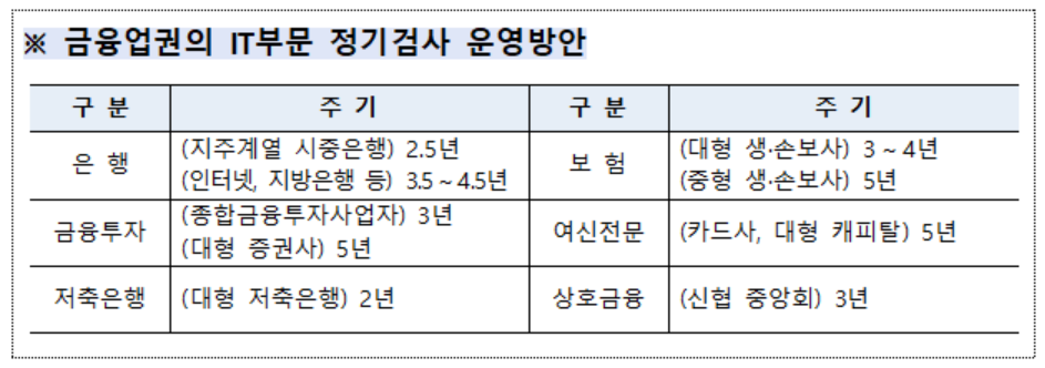 IT인프라 운영 및 정보보호 등 IT업무 전반에 대한 상시평가 과정에서 취약점이 확인되는 경우 금융회사와 전자금융업자에 대해 자체감사를 요구하는 ‘자체감사 요구제도’를 도입‧시범 실시한다.