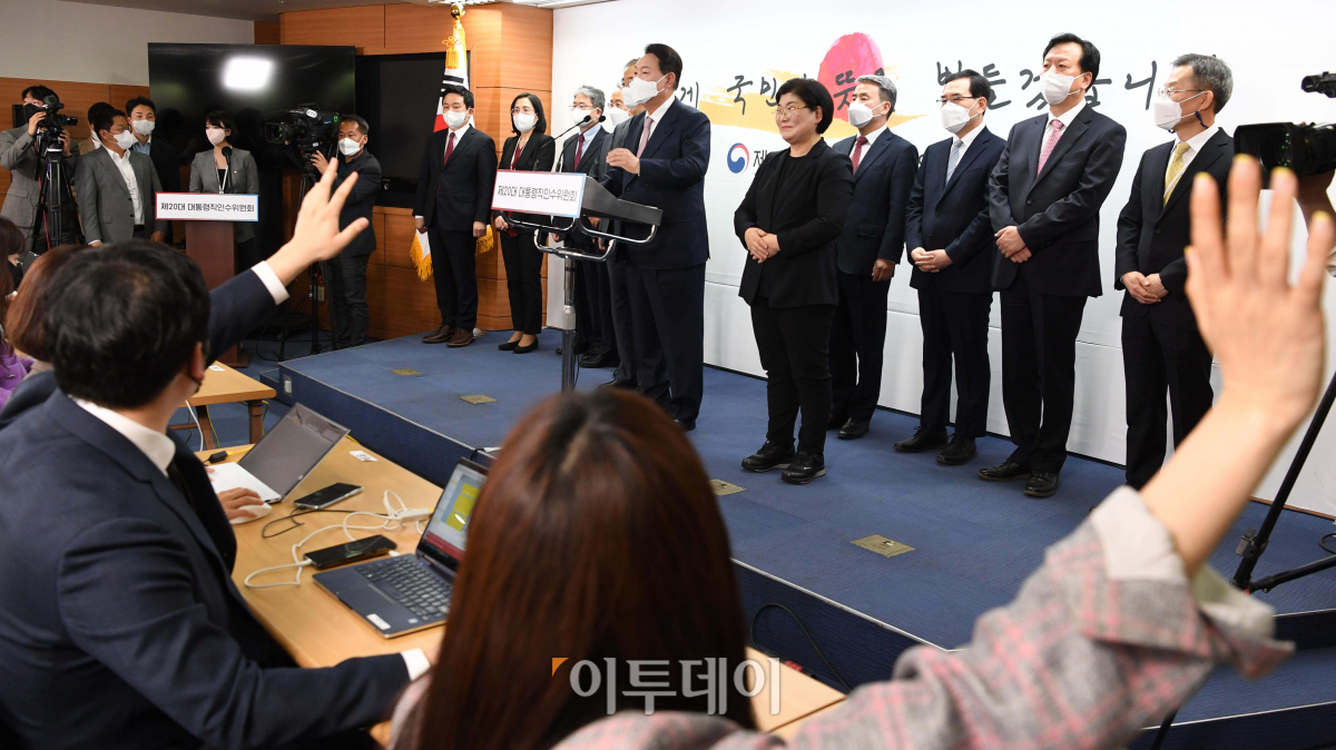 10일 서울 종로구 통의동 인수위에서 윤석열 당선인이 부총리 겸 기획재정부 장관등 일부 내각 인선을 발표 한 후 취재진의 질문을 받고 있다. 왼쪽부터 (수어통사역사 제외) 원희룡 국토교통부, 김현숙 여성가족부, 박보균 문화체육관광부, 추경호 경제부총리 겸 기획재정부 장관 후보자,한덕수 국무총리 후보자, 윤 당선인, 이종섭 국방부, 이창양 산업통상부, 정호영 보건복지부, 이종호 과학기술정통부 장관 후보자. 인수위사진기자단