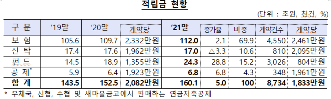 상품별로는 보험이 112조 원으로 전체 적립금의 69.9%를 점유했으며, 펀드(24조3000억 원, 15.2%), 신탁(17조 원, 10.6%) 순으로 나타났다.