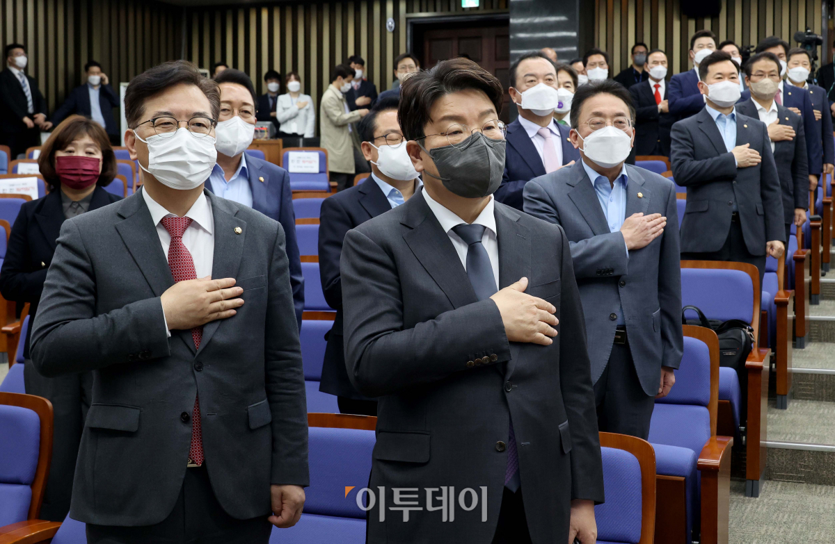 국민의힘 권성동 원내대표와 소속 의원들이 11일 오전 서울 여의도 국회에서 열린 의원총회에서 국민의례를 하고 있다.