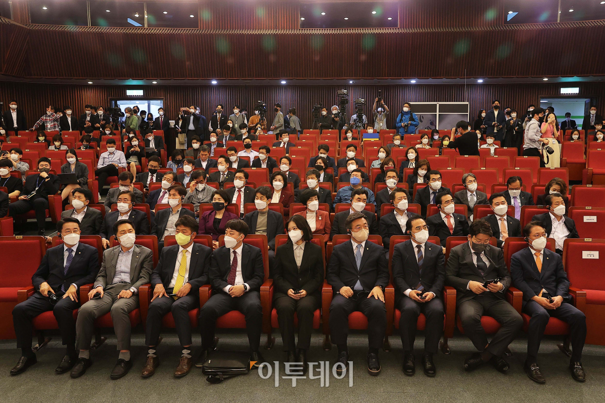 박지현, 윤호중 더불어민주당 공동비대위원장, 박홍근 원내대표와 이준석 국민의힘 대표, 권성동 국민의힘 원내대표를 비롯한 여야 의원들이 11일 오후 서울 여의도 국회 도서관 대강당에서 진행된 볼로디미르 젤렌스키 우크라이나 대통령 화상연설을 지켜보고 있다.