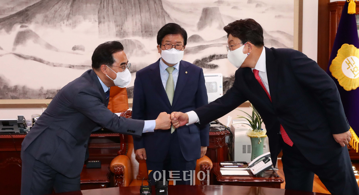 12일 국회 의장실에서 열린 국회의장 여야 원내대표 회동에 참석한 더불어민주당 박홍근 원내대표와 국민의힘 권성동 원내대표가 인사하고 있다.