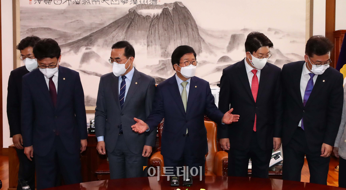 12일 국회 의장실에서 열린 국회의장 여야 원내대표 회동에서 기념촬영을 끝낸 더불어민주당 박홍근 원내대표와 국민의힘 권성동 원내대표가 자리로 돌아가고 있다.