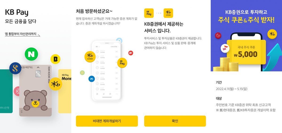 KB증권 주식투자 서비스 이용을 위한 별도의 가입절차는 없다. 이미 KB증권의 계좌를 보유하고 있다면 KB페이를 통해 바로 서비스 이용이 가능하다. KB증권 계좌가 없는 고객은 KB페이에서 신규로 계좌 개설도 진행할 수 있다.