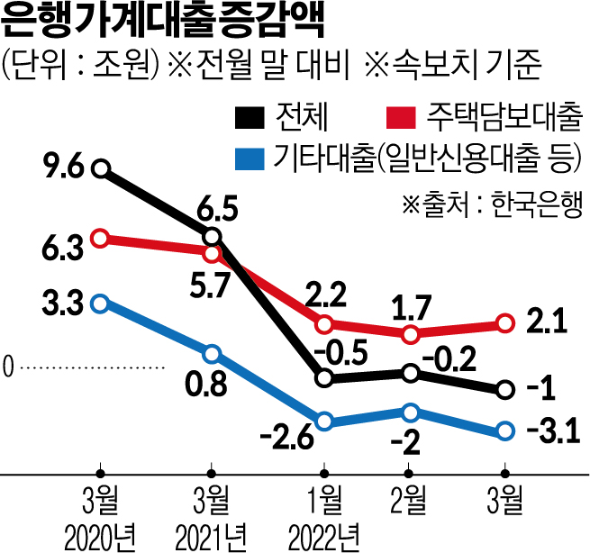 주담대는 3월 중 3조 원 증가해 전월(2조6000억 원) 대비 증가폭이 소폭 확대됐으나 지난해 하반기 이후 둔화세가 유지되고 있다. 같은 기간 기타대출은 은행 및 상호금융권을 중심으로 6조6000억 원 감소해 지난 연말 이후의 감소세가 확대되는 모습이다.