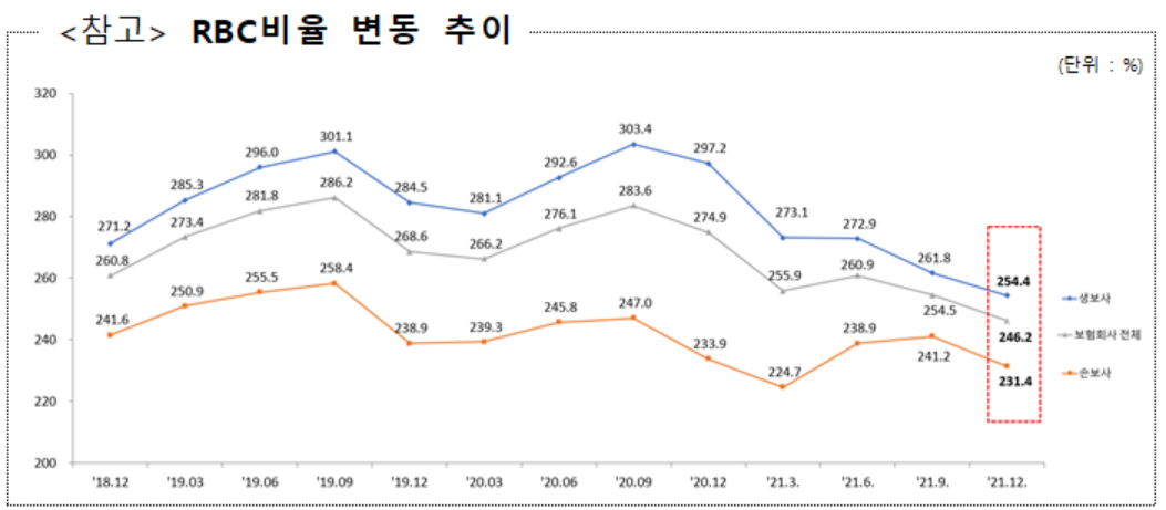 생보사는 254.4%로 전 분기 말 대비 7.4%p 하락했고, 손보사는 231.4%로 전 분기 말 대비 9.8%p 낮아졌다.