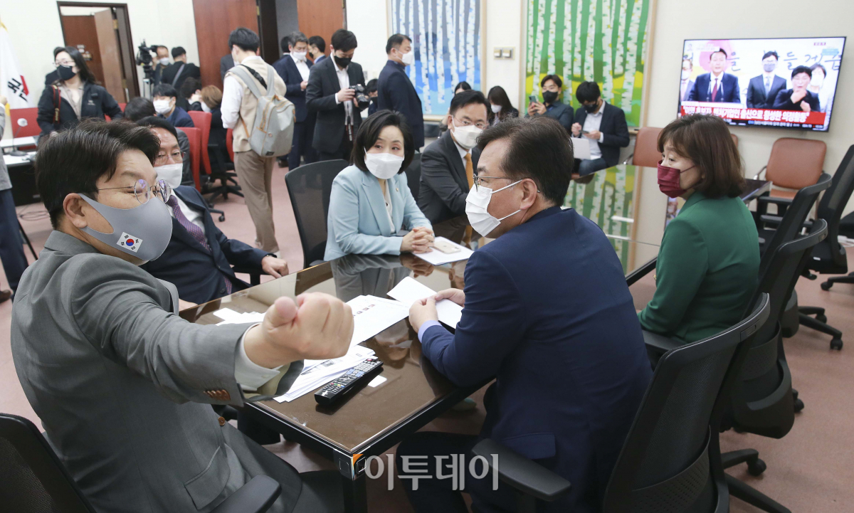 권성동 국민의힘 원내대표와 법사위원이 13일 오후 서울 여의도 국회에서 더불어민주당의 '검수완박'(검찰 수사권 완전 박탈) 관련 긴급기자간담회를 앞두고 대화를 나누고 있다.