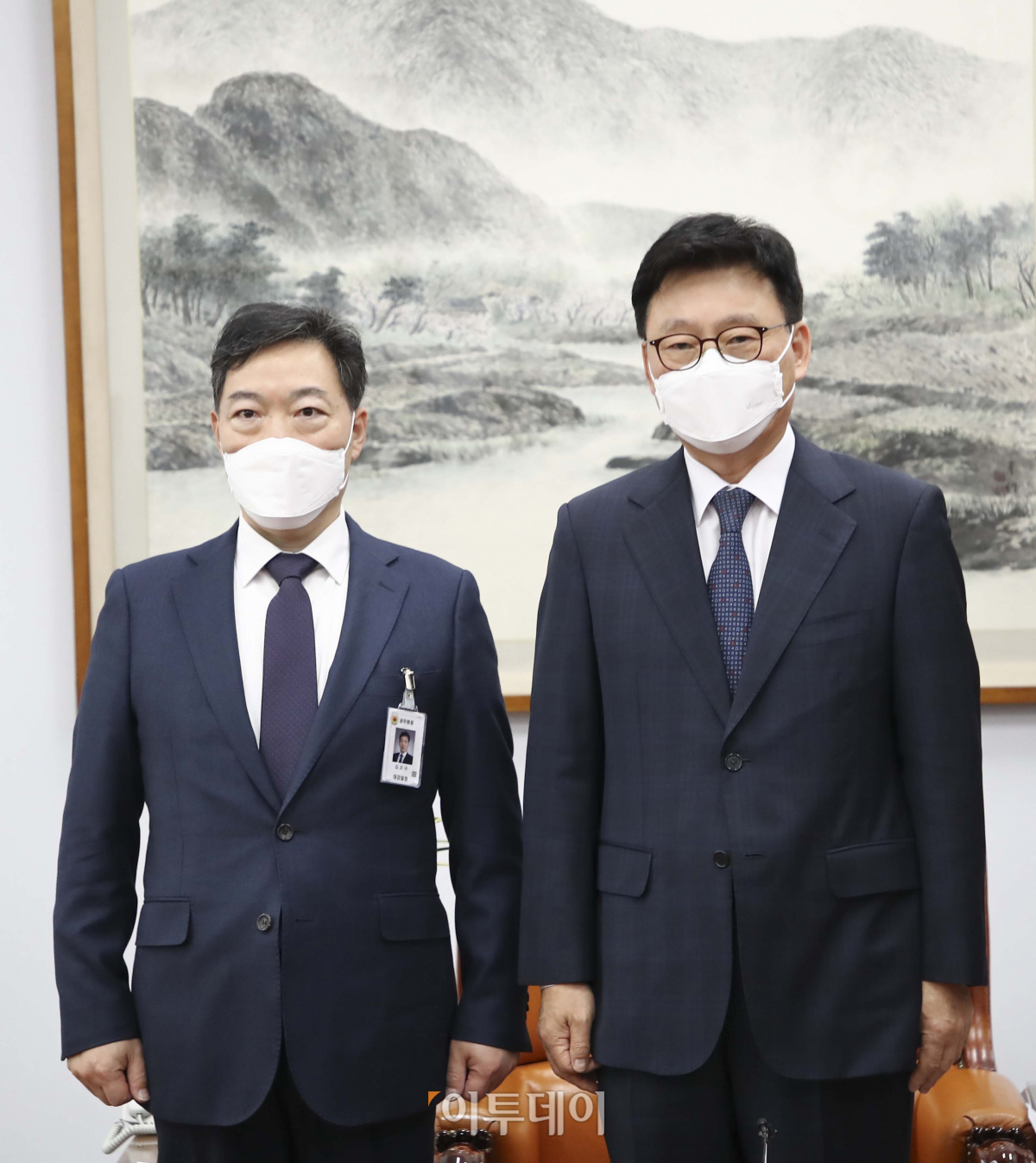 김오수 검찰총장(왼쪽)이 14일 서울 여의도 국회 법사위원장실을 방문 박광온 위원장과 인사를 하고 있다.