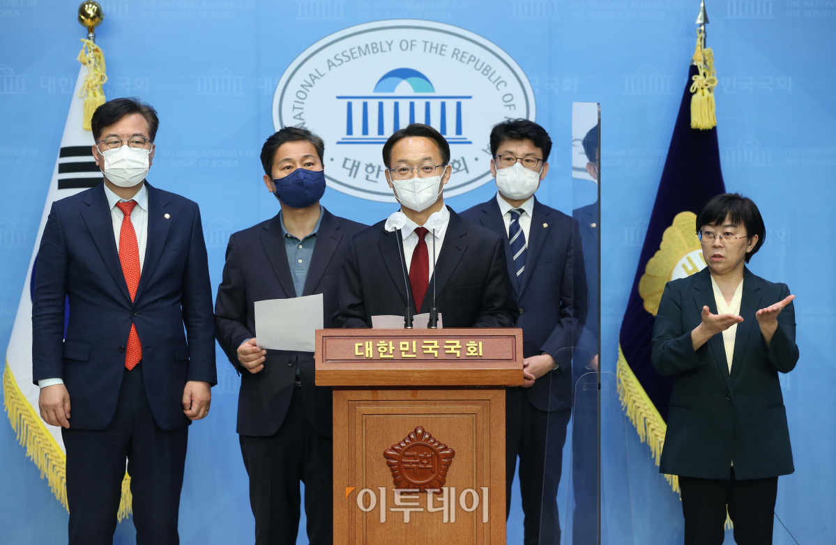 국민의힘 송언석 원내대수석부대표(왼쪽부터), 더불어민주당 김영배 정개특위 간사, 국민의힘 조해진 간사, 더불어민주당 진성준 원내수석부대표가 14일 오전 서울 여의도 국회 소통관 기자회견장에서 양당 원내수석-정개특위 간사 정개특위 합의 발표문을 발표하고 있다.
