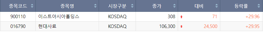 먼저 이스트아시아홀딩스는 그랜드엠파이어인터내셔널그룹리미티트(이하 그랜드엠파이어) 자회사 편입 소식에 전날에 이어 2거래일 연속 상한가를 기록했다.