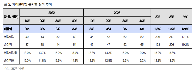 IBK투자증권은 15일 제이브이엠에 대해 1분기 실적 성장을 신호탄으로 국내·외 실적 모두가 개선되는 성장 사이클에 진입할 전망이라고 분석했다. 이에 목표주가를 기존 2만2000원에서 2만8000원으로 상향했고 투자의견은 ‘매수’를 유지했다.