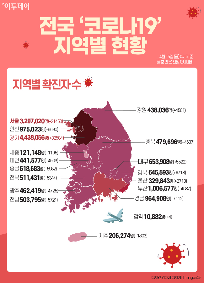 신규 확진자 12만5846명 중 2만1450명은 서울에서 발생했으며, 부산 4587명, 대구 5522명, 인천 6690명, 광주 4725명, 대전 4503명, 울산 2713명, 세종 1195명, 경기 3만2584명, 강원 4561명, 충북 4637명, 충남 5982명, 전북 5344명, 전남 5721명, 경북 6713명, 경남 7112명, 제주에서 1803명이 각각 확진됐다. 확진자 12만5846명 중 지역발생 확진자는 12만5832명으로 집계됐다. 검역소 확진자도 4명이 추가됐다.