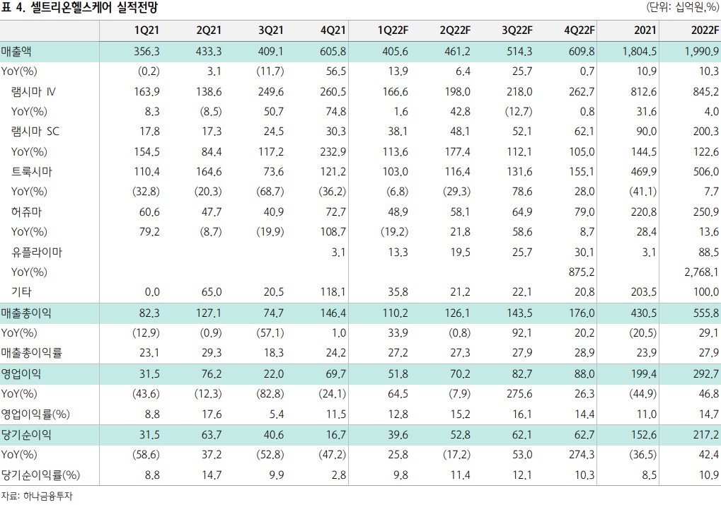 그는 “올해 연간 기준으로 견조한 실적이 예상되며 2023년 이후 대형 신제품 출시가 예정돼 있어 양호한 주가 흐름이 기대된다”며 “회계 감리 이슈 해소에도 바이오시밀러 산업의 성장성에 대한 우려로 주가가 부진한 상황이나 유플라이마, 램시마SC가 유의미한 침투율을 기록한다면 멀티플 리레이팅이 이뤄질 수 있다”고 덧붙였다.