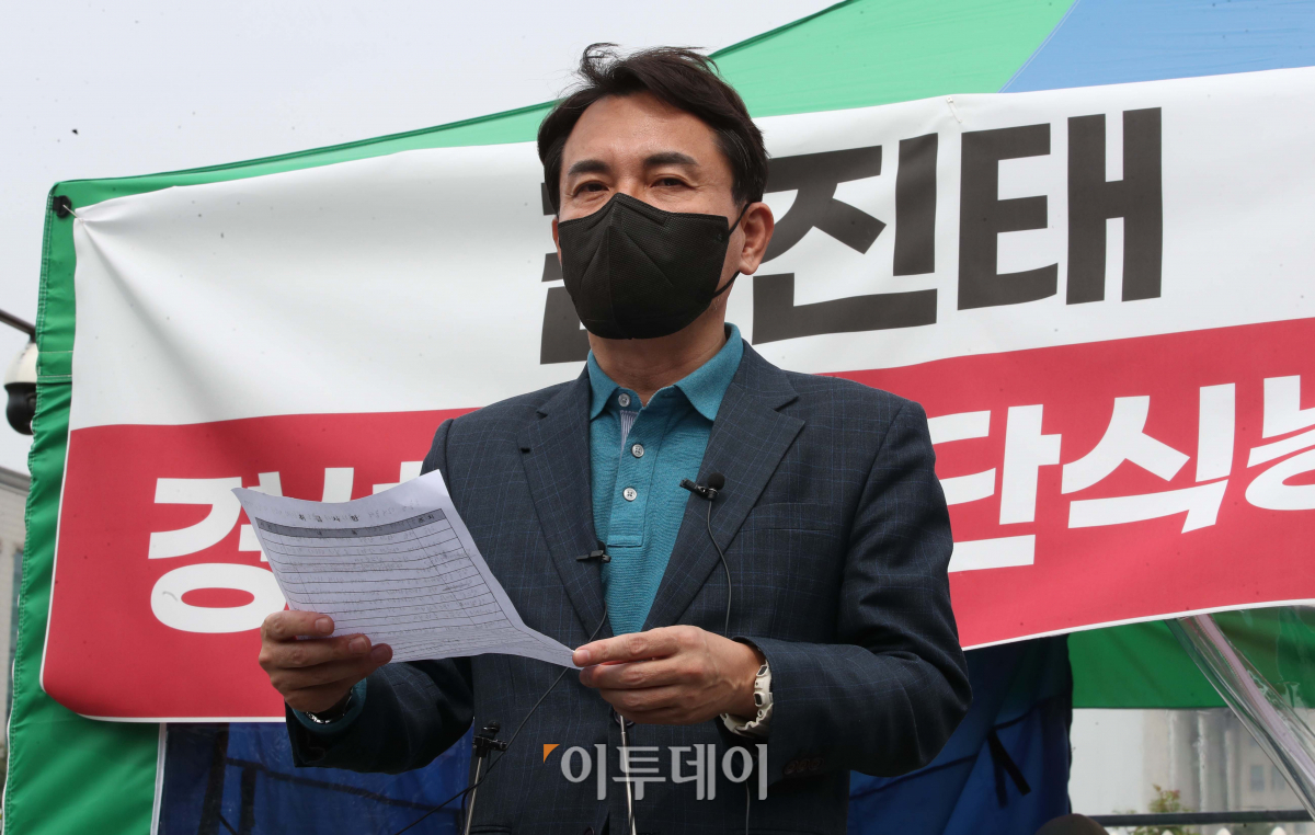 김진태 전 국민의힘 의원이 18일 서울 여의도 국회 앞 농성장에서 5·18과 불교 관련 문제 발언에 대해 사과하는 내용의 기자회견을 하고 있다.