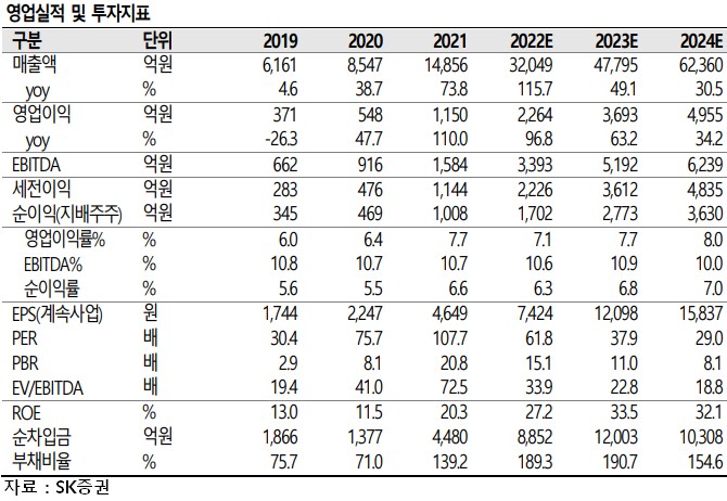 그는 “2022년 실적은 매출액 3.2조 원, 영업이익 2264억 원, 영업이익률 7.1%로 2021년 매출액 성장률 74%를 뛰어넘을 것”이라며 “차량용 반도체가 부족한 완성차 업체들은 전기차 신차에 차량용 반도체를 좀 더 할당하고 있으며, 이러한 완성차들의 전략은 에코프로비엠의 하이니켈 양극재 수요를 탄탄히 뒷받침해주고 있다”고 판단했다.