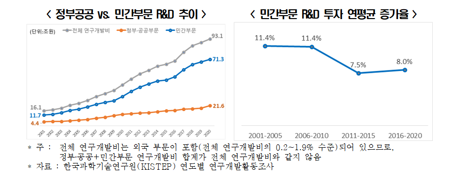 국내 R&D에 있어 민간의 중요성에도 불구하고 2001년~2020년 중 민간부문 R&D 증가율을 5년 단위로 살펴보면 2000년대에는 11.4%의 증가율을 보였으나, 2011년 이후에는 7.5%로 둔화한 이후 답보상태인 것으로 나타났다.
