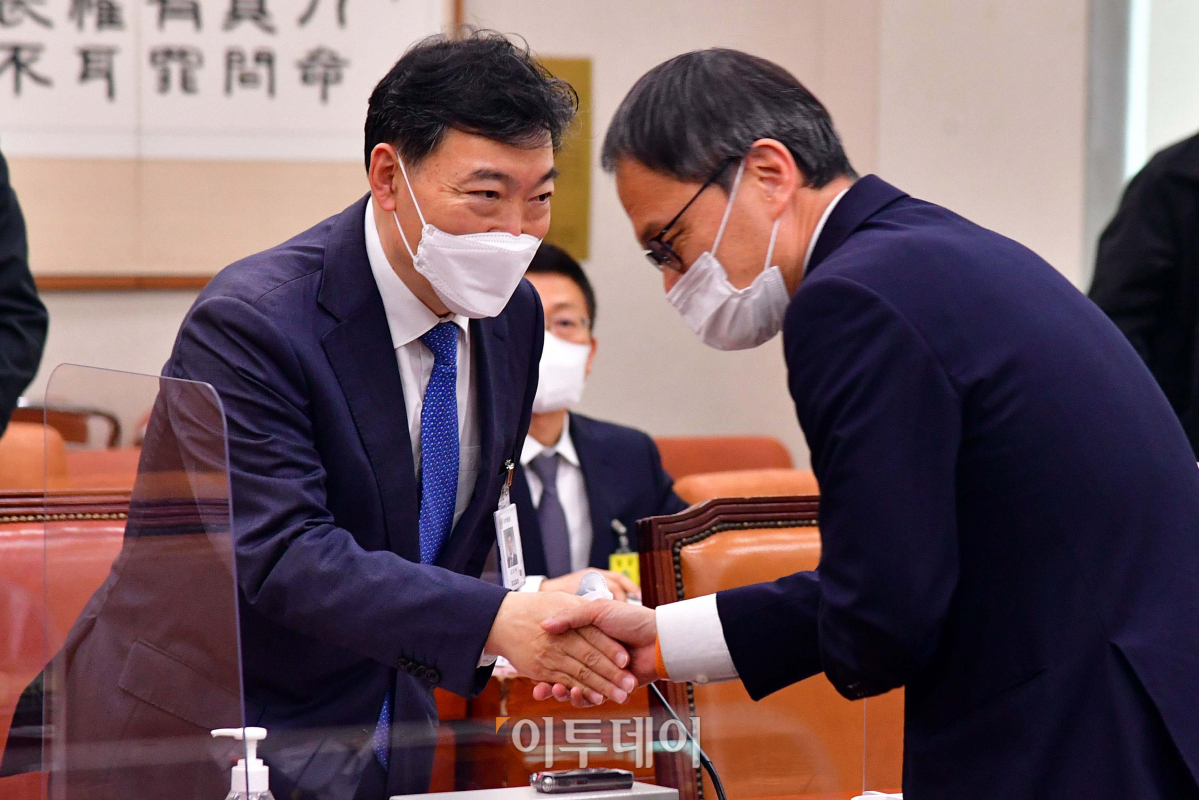 19일 서울 여의도 국회에서 열린 법제사법위원회 법안심사제1소위원회의에서 박주민 위원장이 '검수완박' 법안 입법과 관련한 의견 발표를 위해 출석한 김오수 검찰총장과 인사를 하고 있다.
