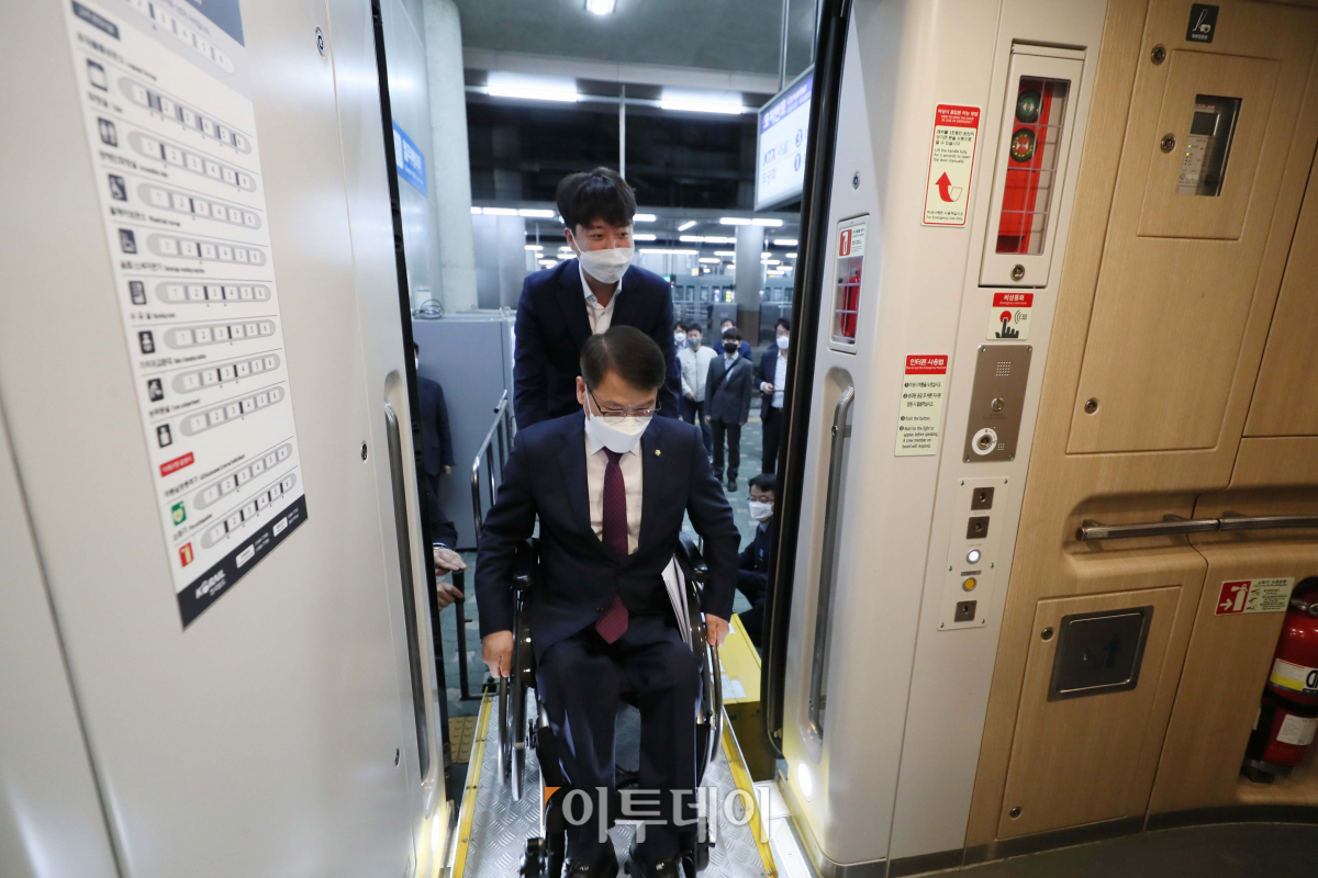 [포토] 휠체어 리프트로 KTX 탑승하는 이준석 대표-이종성 의원