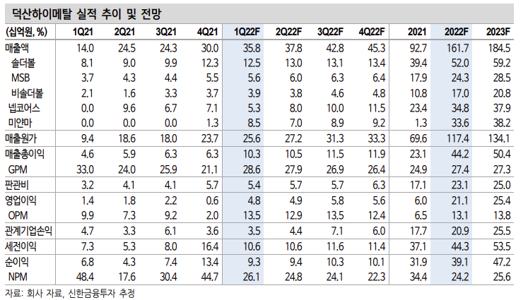 김찬우 신한금융투자 연구원은 “1분기 매출액은 358억 원, 영업이익은 48억 원으로 전년 동기 대비 각각 156.8%, 251.5% 증가할 것으로 전망한다”며 “가장 중요한 덕산하이메탈의 본업은 견조한 실적을 보일 것으로 기대된다”고 분석했다.