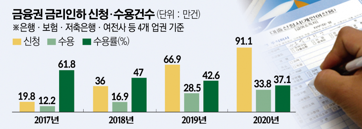 신청건수 집계 기준도 △신청 후 고객 신청철회 건은 제외 △단순 유선상담건 제외, 중복신청건은 모두 포함 △신용도 개선 등과 무관하게 거래관계 등을 바탕으로 금리인하를 요구하는 등의 민원성 금리조정 요구는 포함하지 않음 △금리인하요구 대상상품이 아닌 건에 대한 신청(접수)건은 제외 △서류제출 미비, 서류미보완으로 종결된 건 제외로 구체화했다.