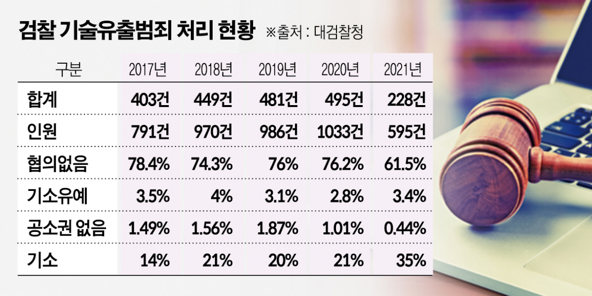 기술 유출 사범을 검거해도 처벌 수준은 대부분 집행유예나 벌금형에 그치고 있다.