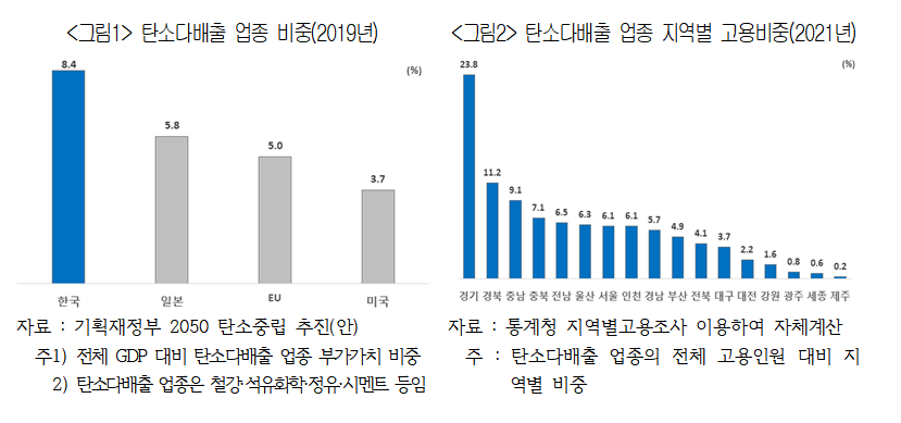 우리나라 전체 산업 중 탄소다배출 업종(철강ㆍ석유화학ㆍ정유ㆍ시멘트 등)은 8.4%로 일본(5.8%), 유럽연합(EU·5.0%), 미국(3.7%)을 크게 웃도는데 이들 산업의 고용은 경기(23.8%)를 제외하면 경북(11.2%), 충남(9.1%), 충북(7.1%), 전남(6.5%) 등 지방 도시에서 대부분 이뤄졌다.
