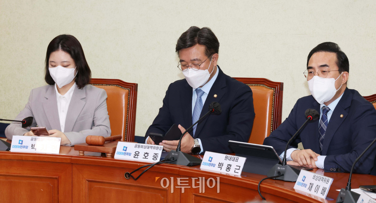 박홍근 더불어민주당 원내대표(오른쪽 첫번째)가 25일 국회에서 열린 비상대책위원회 회의에서 발언하고 있다.