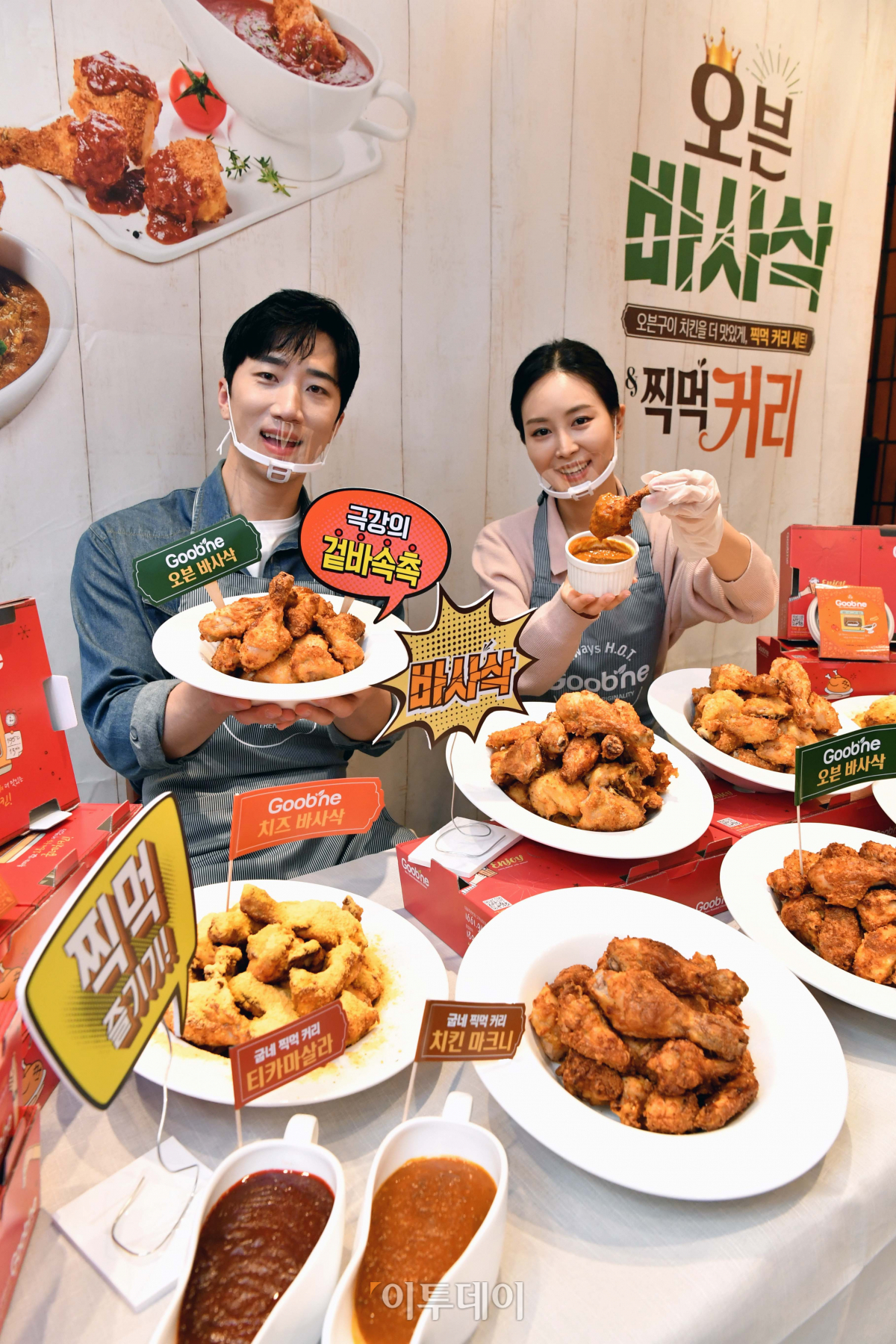 굽네가 26일 서울 종로구 굽네치킨 종각역점에서 신제품 ‘오븐 바사삭’과 ‘찍먹 커리’를 선보이고 있다. 오븐 바사삭은 굽네가 ‘고추 바사삭’ 출시 후 10년만에 선보이는 바사삭 라인 메뉴로 쌀가루와 현미가루를 입혀 겉은 바삭하고 속은 촉촉한 식감을 강조했다. 찍먹 커리는 치킨 또는 밥에 곁들여 먹기 좋다.