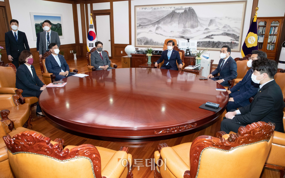 박홍근 더불어민주당 원내대표와 권성동 국민의힘 원내대표가 26일 오전 서울 여의도 국회에서 박병석 국회의장 주재로 열린 양당 원내대표 회동에 참석해 있다.